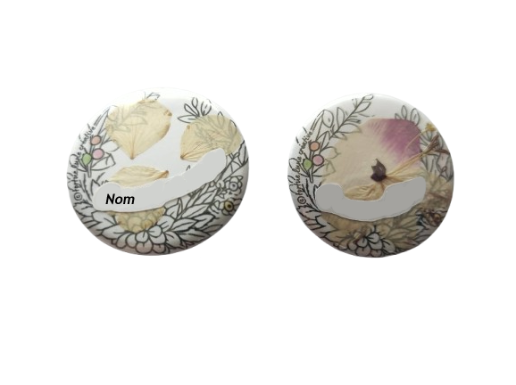 Petit badge floral avec une fleur ou pétale séchée à l’intérieur (fait par mes soins). Le choix de cet élément sera à réaliser en fonction des noms fournis et à indiquer dans l’onglet de votre commande où vous pouvez laisser un petit mot. Ne vous inquiétez pas si ce n’est pas clair ou que j’ai besoin de plus d’informations, je vous enverrais un mail (vous pouvez aussi en envoyer un si vous préférez via le formulaire de contact).