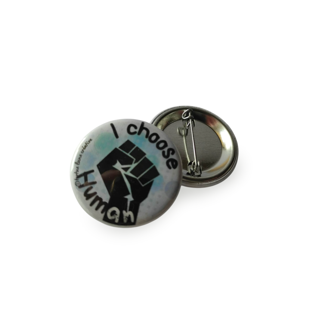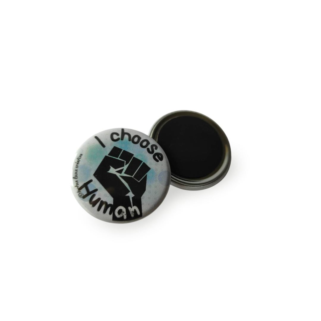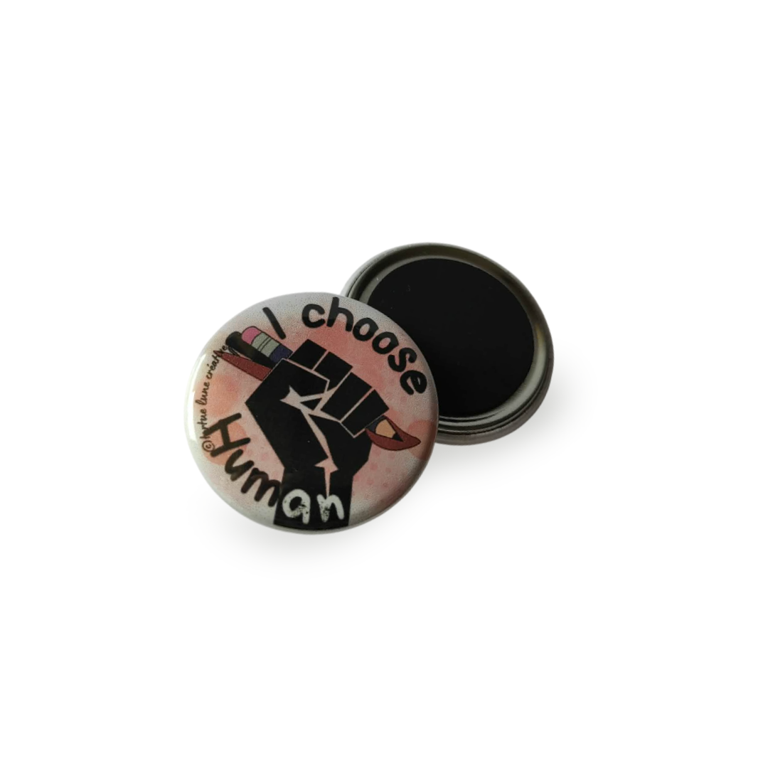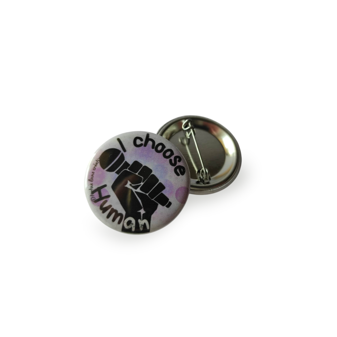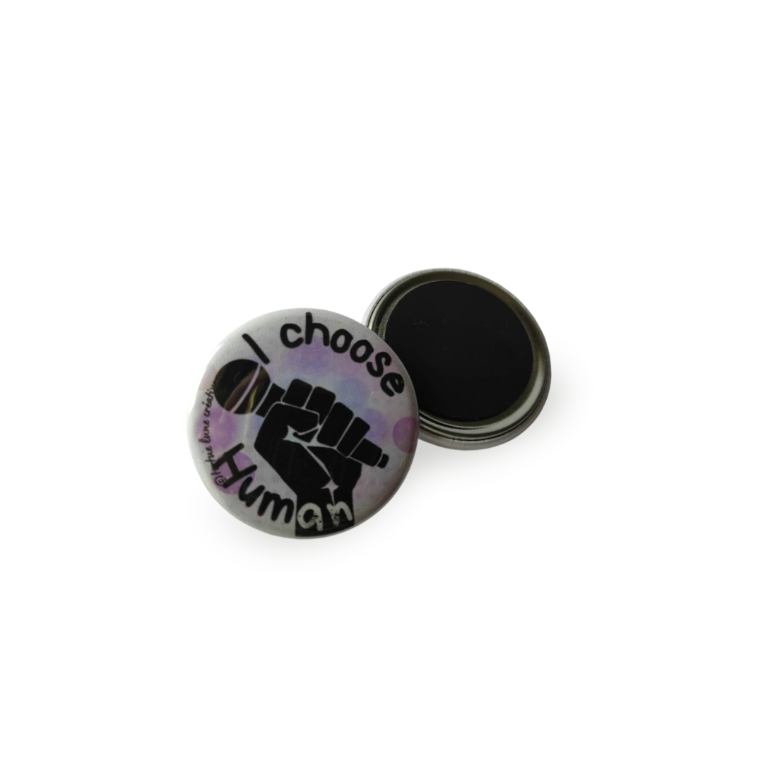 Badge à épingle ou aimant sur le thème de l' »IA » nommé : I choose human.