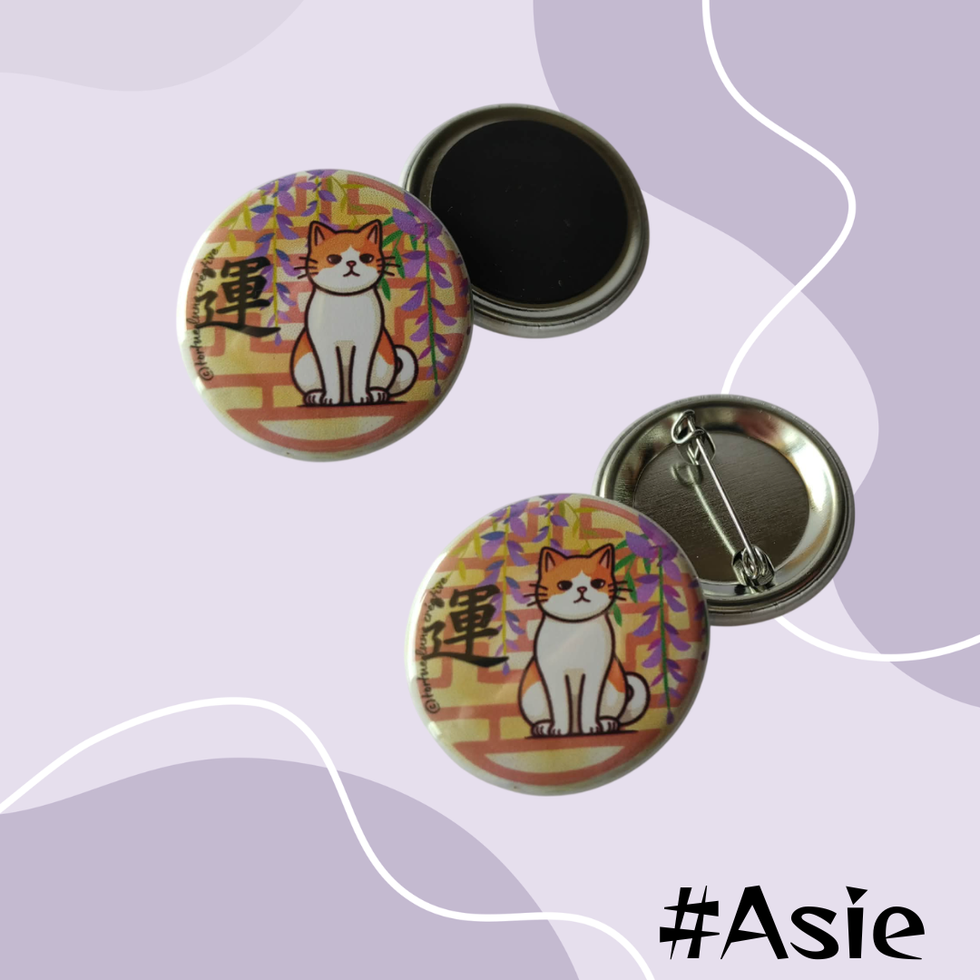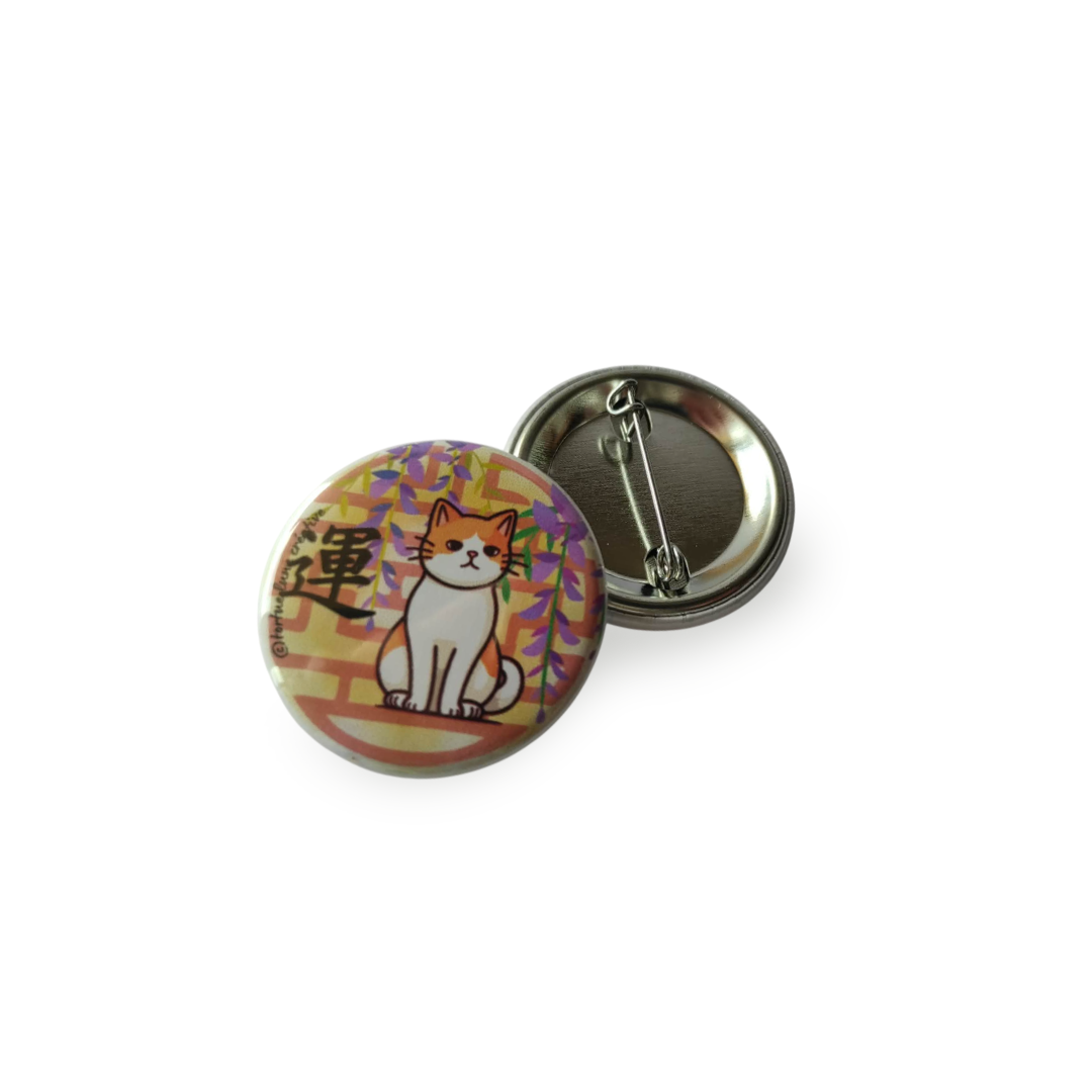 Petit badge sur le thème de l’Asie, avec une représentation d’un chat et du kanji chance.